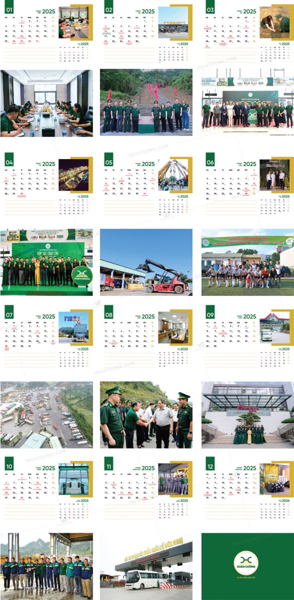In Việt Dũng tự hào là đơn vị thiết kế và in ấn lịch để bàn Tết 2025 cho Công ty cổ phần Hữu Nghị Xuân Cương với phong cách thể hiện tinh tế, đậm bản sắc địa phương. Thiết kế sử dụng tông xanh lá - vàng đồng làm chủ đạo, biểu trưng cho sự phát triển bền vững và thịnh vượng. Hình ảnh cổng ra vào nơi tập kết xe của Xuân Cường được chọn làm điểm nhấn chính.