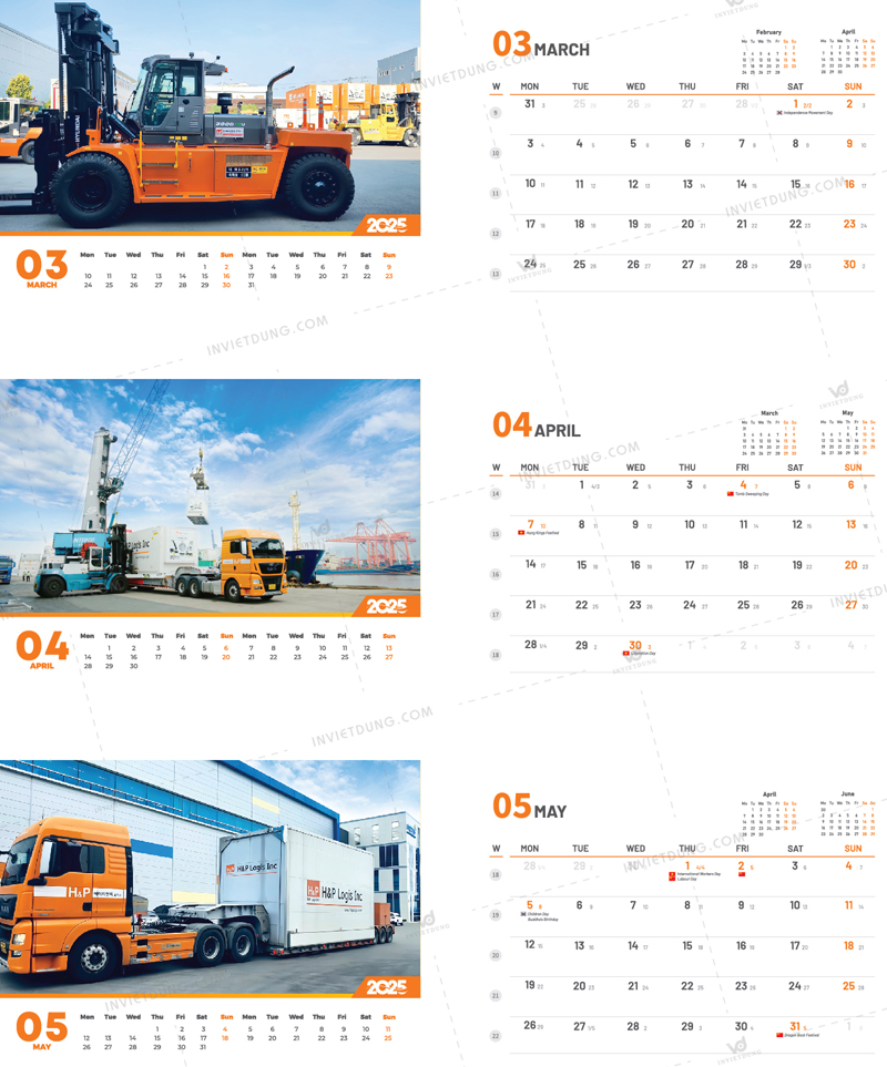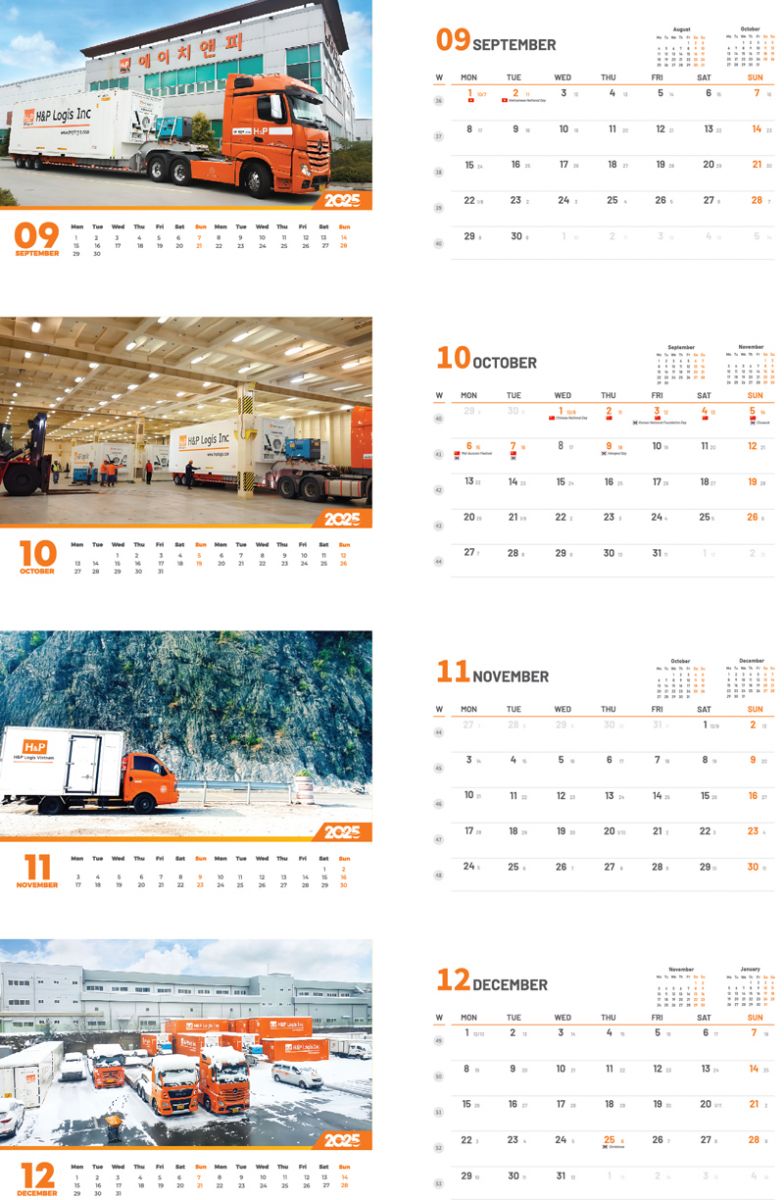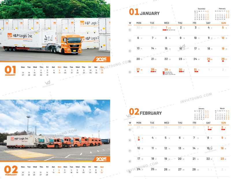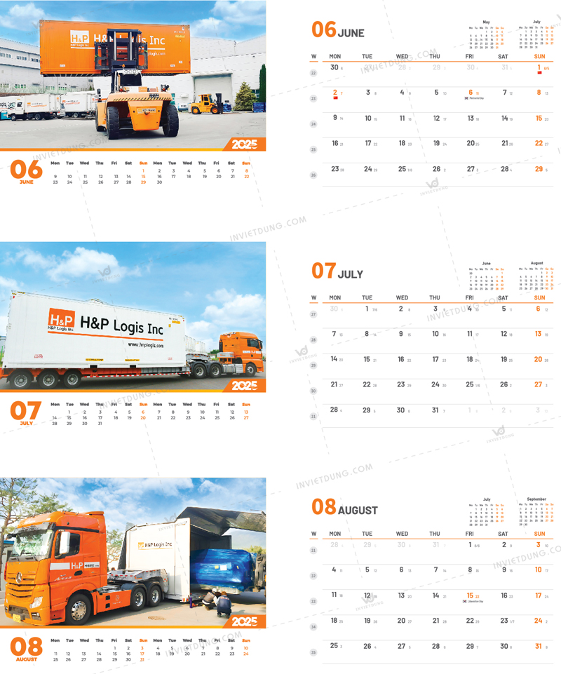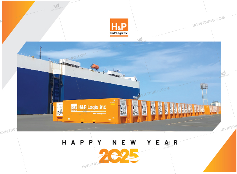 Mẫu lịch để bàn cho công ty H&P Logistics do In Việt Dũng thiết kế và in ấn thể hiện rõ hình ảnh thương hiệu Logistics hiện đại, mạnh mẽ, năng động trong năm 2025.