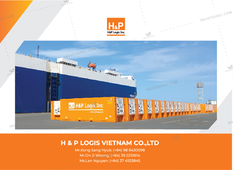 Thiết kế chủ đạo với gam màu cam trắng (đồng bộ với logo thương hiệu) cùng hình ảnh container, xe đầu kéo và tàu hàng - biểu trưng cho hành trình kết nối của doanh nghiệp với khách hàng, mang lại cảm giác chuyển động và phát triển khung ngừng.
